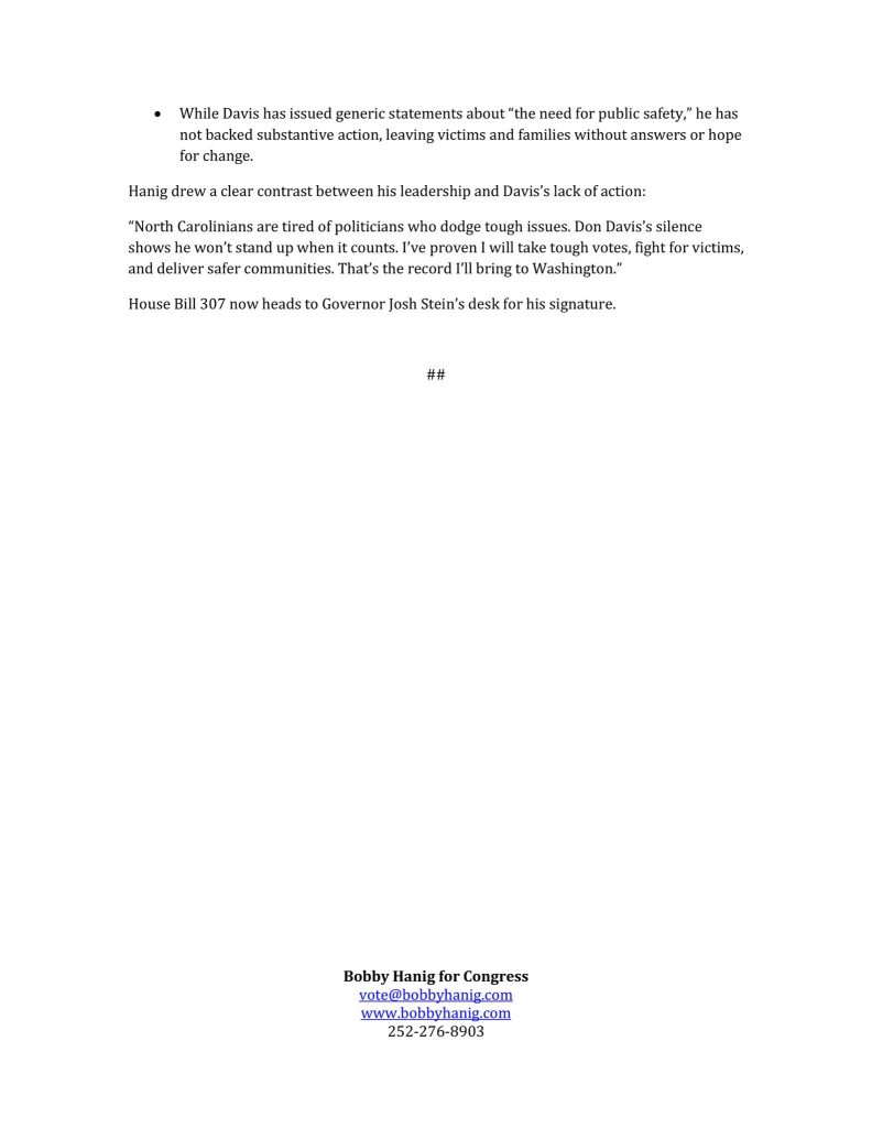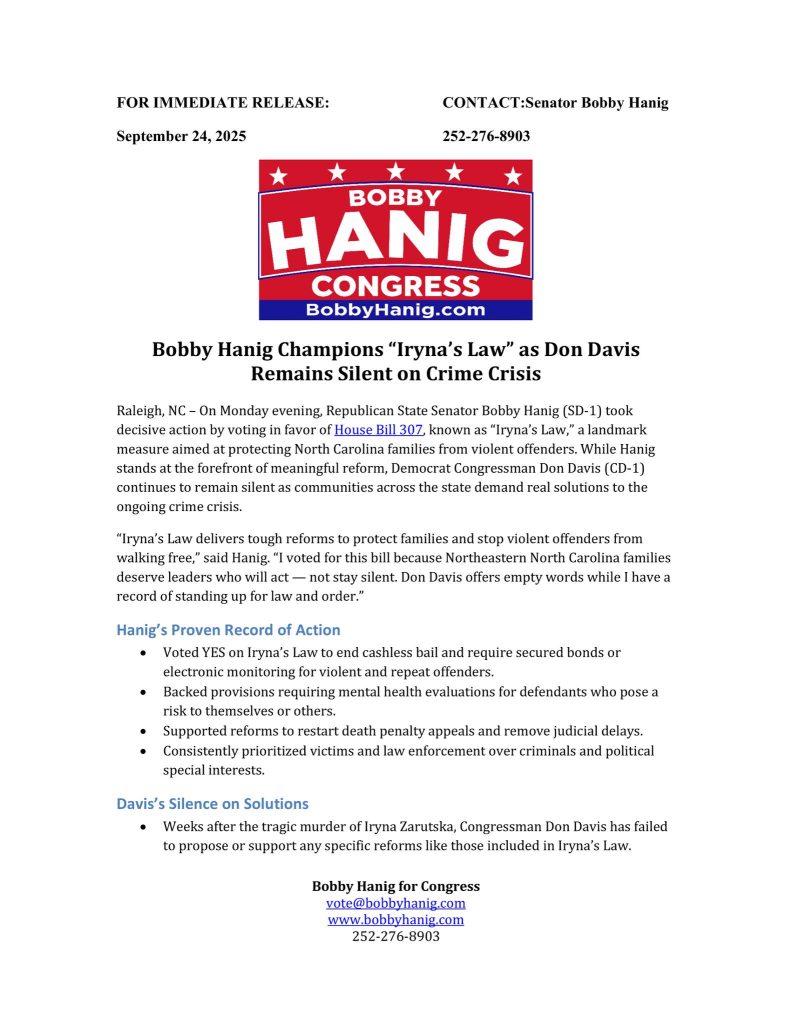 “Iryna’s Law delivers tough reforms to protect families and stop violent offenders from walking free,” said Hanig. “I voted for this bill because Northeastern North Carolina families deserve leaders who will act — not stay silent. Don Davis offers empty words while I have a record of standing up for law and order.”